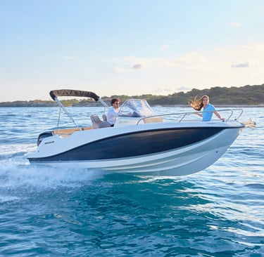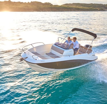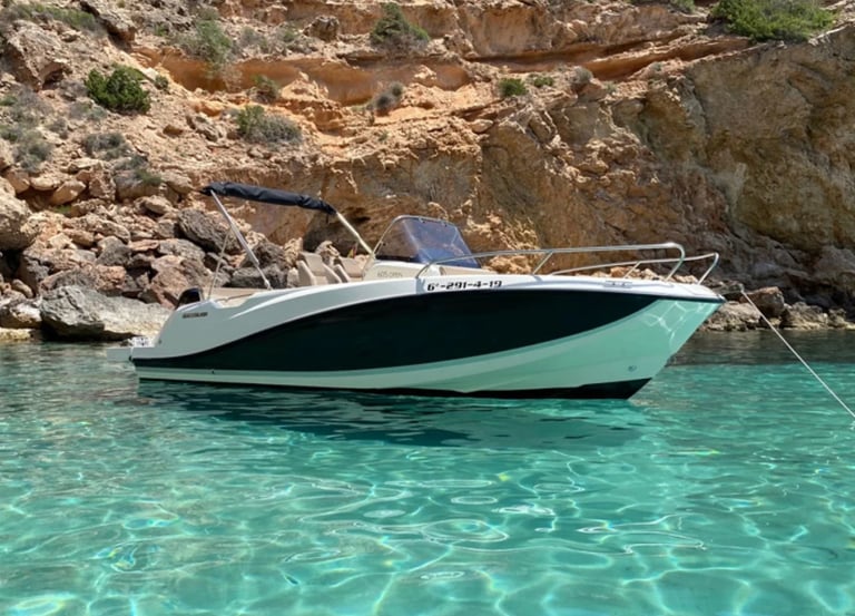 La Quicksilver 605 es una embarcación versátil y compacta. Con una eslora de aproximadamente 6 metros, destaca por su diseño funcional que maximiza el espacio y la comodidad a bordo.