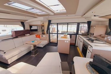 El AURA PAJOT 51 viene equipado con todas las comodidades: cocina completa, sistema de navegación de última generación, equipo de sonido, y opciones para actividades acuáticas como paddle surf y snorkel. Este equipamiento permite a los huéspedes disfrutar de una estancia completa y llena de diversión.