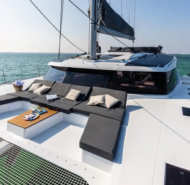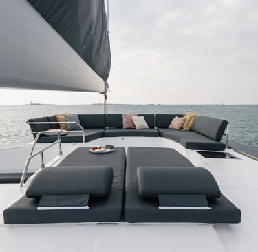 Equipado con hasta cuatro camarotes dobles, cada uno con baños privados, el AURA PAJOT 51 ofrece la privacidad y el confort necesarios para grupos y familias. Los camarotes están decorados con materiales de alta calidad y cuentan con espacio de almacenamiento amplio, ofreciendo el descanso perfecto después de un día de actividades en el mar.Zona de Solárium en la Proa y Flybridge