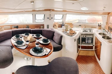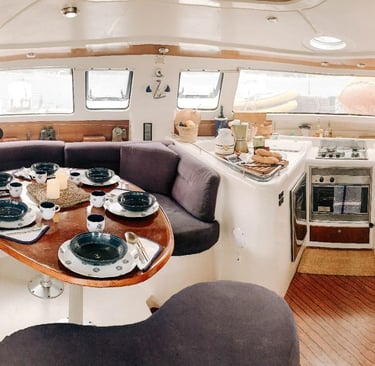 El Belizcuenta con un salón principal amplio y bien iluminado, ideal para relajarse y disfrutar de la vista al mar. Su distribución abierta ofrece espacio suficiente para que todos los pasajeros se muevan cómodamente, con áreas para socializar, cenar o simplemente disfrutar de la navegación.Camarotes Confortables y Acogedores