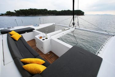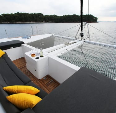 Equipado con hasta cuatro camarotes dobles el Lagoon 440 brinda una experiencia de descanso similar a la de un hotel flotante. Cada camarote cuenta con amplio espacio de almacenamiento y camas confortables, ofreciendo privacidad y comodidad para cada pasajero.Zona de Solárium en Proa y Espacio Exterior